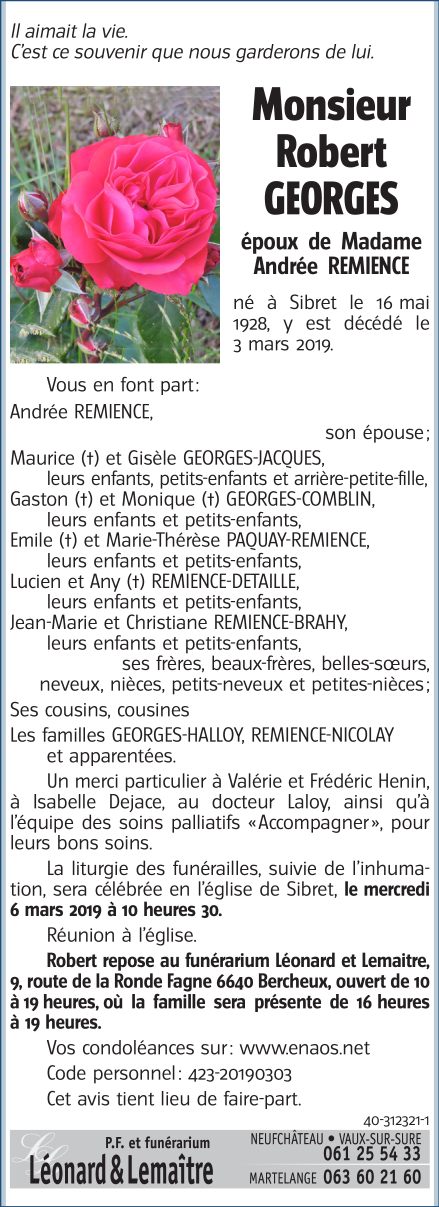 Décédé à Sibret (6640) le dimanche 3 mars 2019 à l'âge de 90 ans