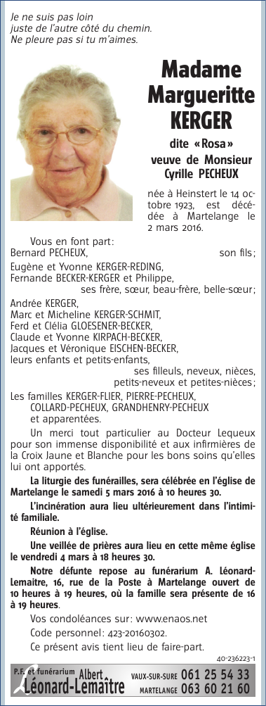 Décédée à Martelange (6630) le mercredi 2 mars 2016 à l'âge de 92 ans