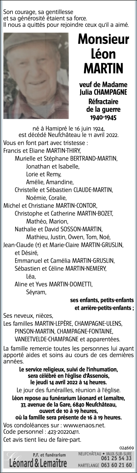 Décédé à Neufchâteau (6840) le lundi 11 avril 2022 à l'âge de 97 ans