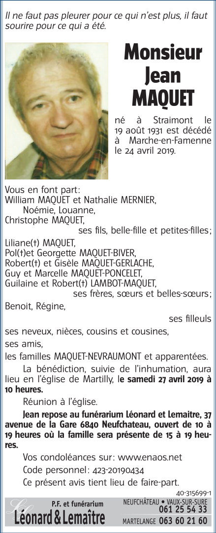Décédé à Marche-en-Famenne (6900) le mercredi 24 avril 2019 à l'âge de 87 ans