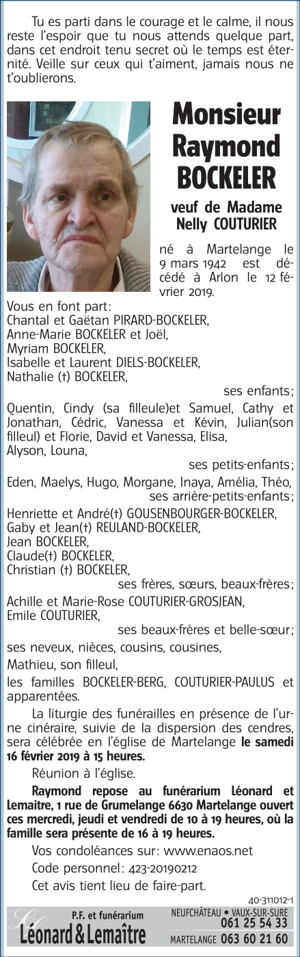 Décédé à Arlon (6700) le mardi 12 février 2019 à l'âge de 76 ans