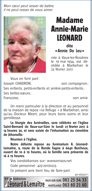 Décédée à Marbehan (6724) le jeudi 23 février 2017 à l'âge de 82 ans