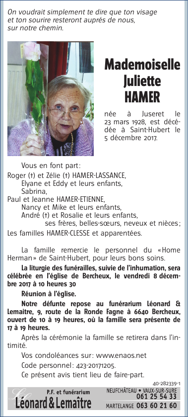 Décédée à Saint-Hubert (6870) le mardi 5 décembre 2017 à l'âge de 89 ans