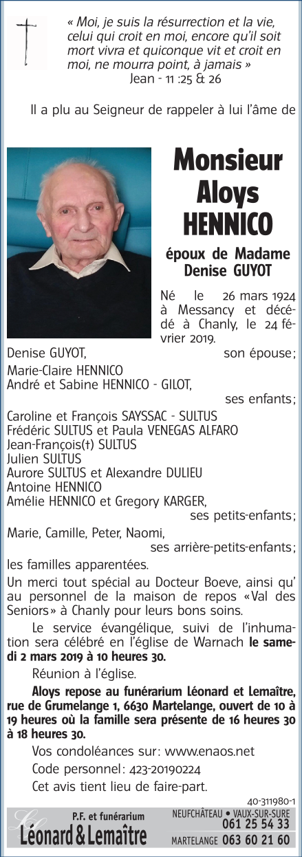 Décédé à Chanly (6921) le dimanche 24 février 2019 à l'âge de 94 ans