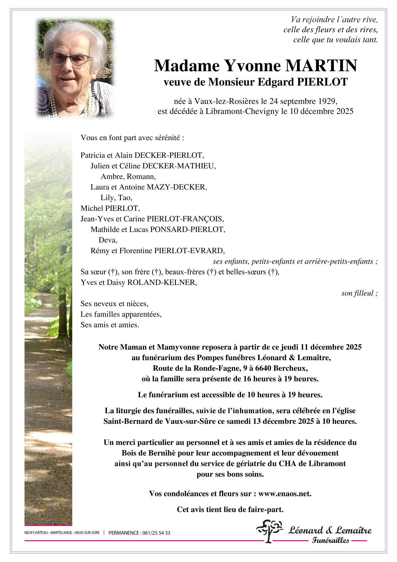 Décédée à Libramont-Chevigny (6800) le mercredi 10 décembre 2025 à l'âge de 96 ans