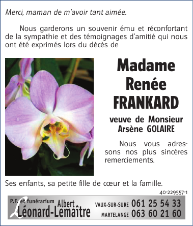 Décédée à Bercheux (6640) le lundi 7 décembre 2015 à l'âge de 83 ans
