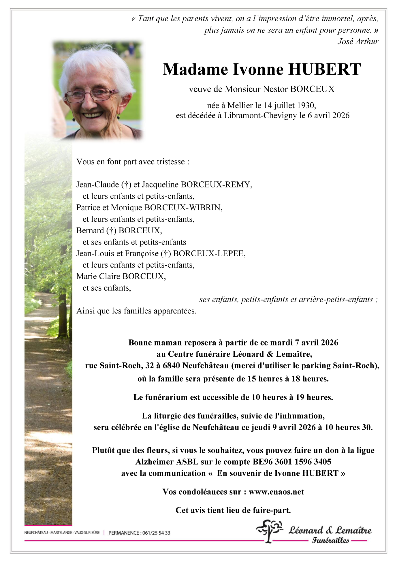 Décédée à Libramont-Chevigny (6800) le lundi 6 avril 2026 à l'âge de 95 ans