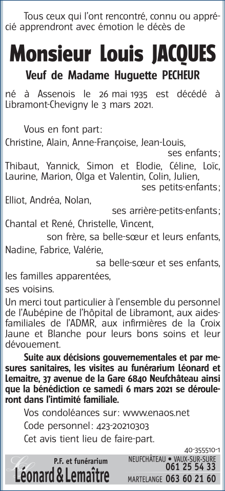 Décédé à Libramont-Chevigny (6800) le mercredi 3 mars 2021 à l'âge de 85 ans