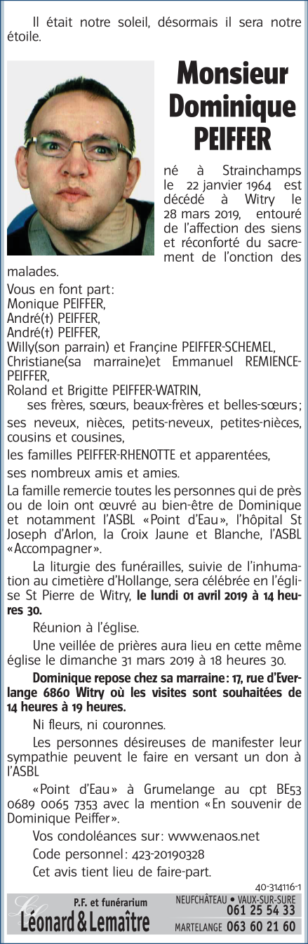 Décédé à Witry (6860) le vendredi 29 mars 2019 à l'âge de 55 ans
