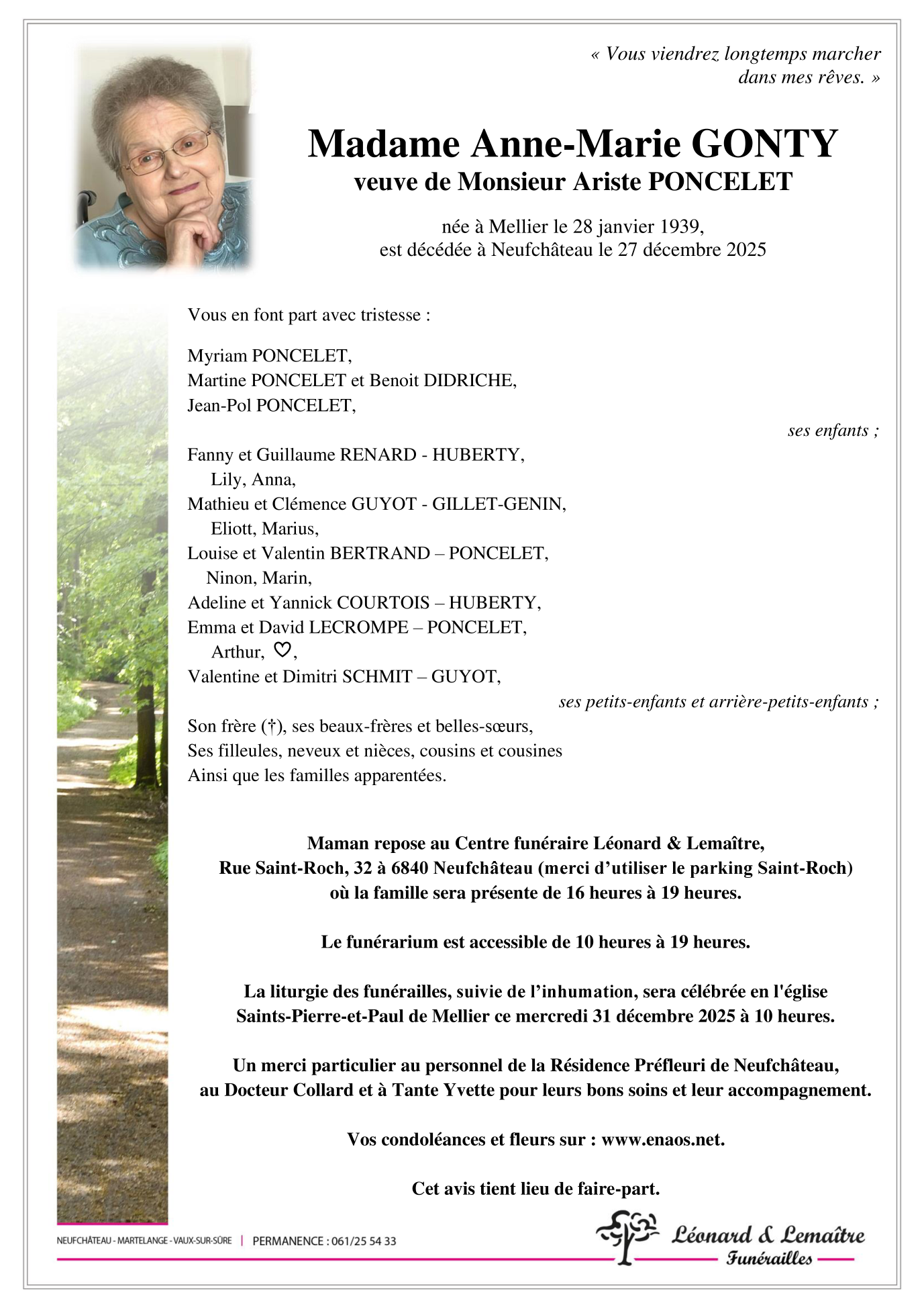 Décédée à Neufchâteau (6840) le samedi 27 décembre 2025 à l'âge de 86 ans