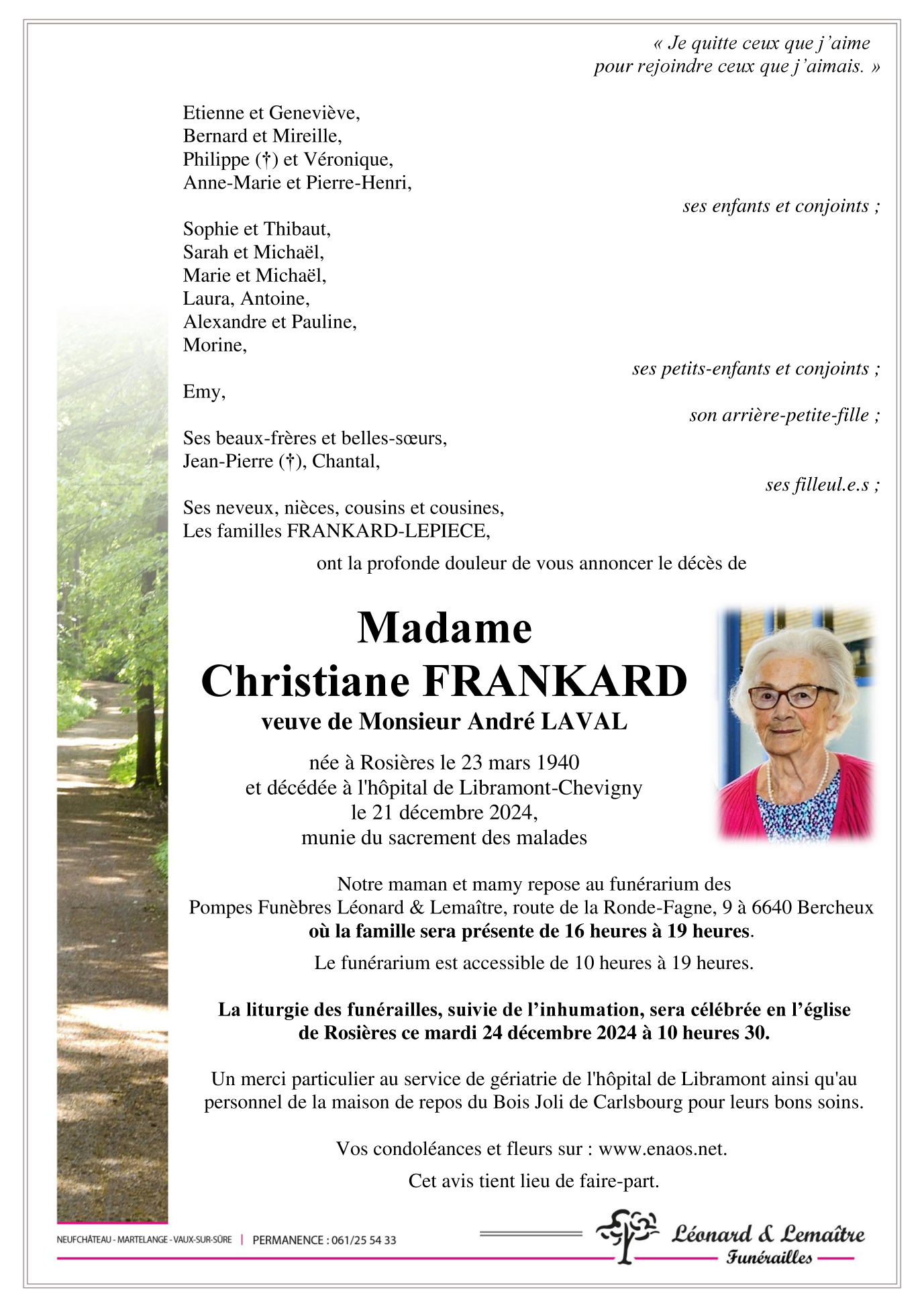 Décédée à Libramont-Chevigny (6800) le samedi 21 décembre 2024 à l'âge de 84 ans