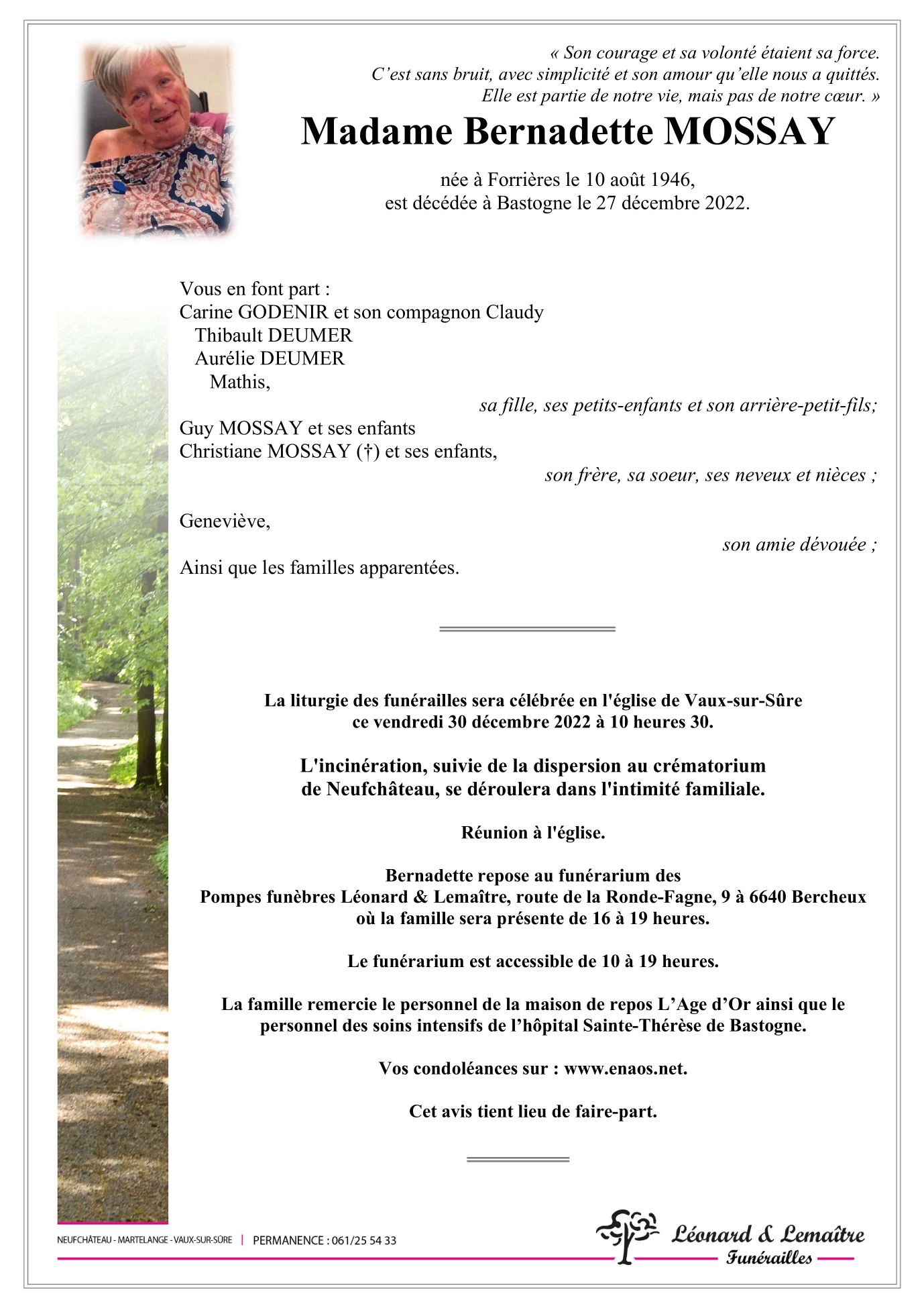 Décédée à Bastogne (6600) le mardi 27 décembre 2022 à l'âge de 76 ans