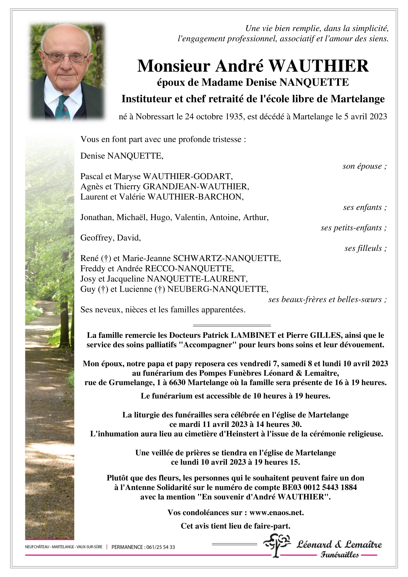 Décédé à Martelange (6630) le mercredi 5 avril 2023 à l'âge de 87 ans