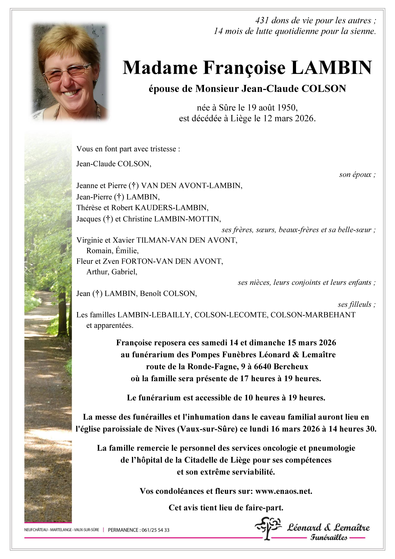 Décédée à Liège (4000) le jeudi 12 mars 2026 à l'âge de 75 ans