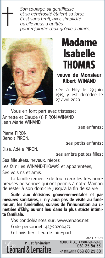 Décédée à Ebly (6860) le lundi 27 avril 2020 à l'âge de 100 ans