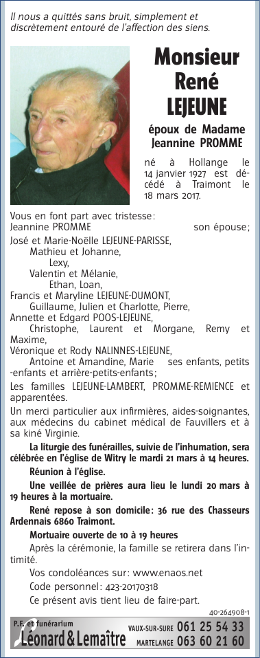 Décédé à Traimont (6860) le samedi 18 mars 2017 à l'âge de 90 ans