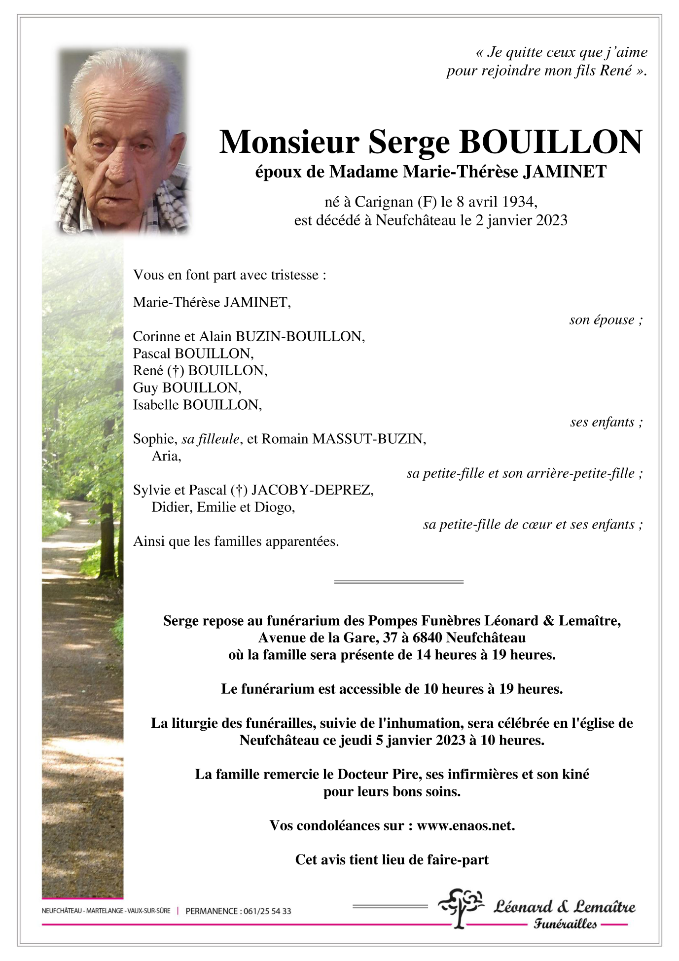 Décédé à Neufchâteau (6840) le lundi 2 janvier 2023 à l'âge de 88 ans