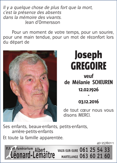 Décédé à Bastogne (6600) le samedi 3 décembre 2016 à l'âge de 90 ans
