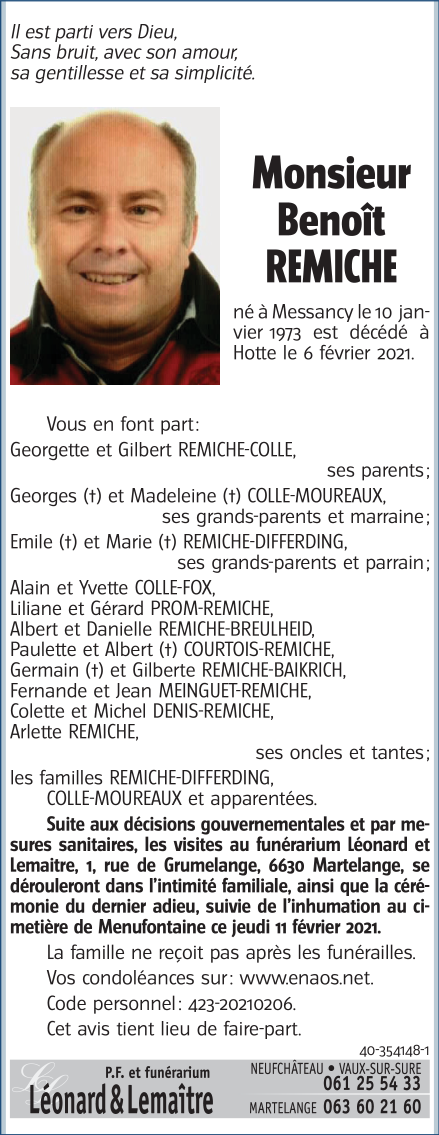 Décédé à Hotte (6637) le samedi 6 février 2021 à l'âge de 48 ans
