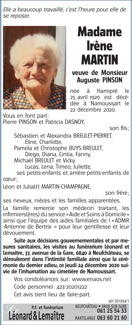 Décédée à Neufchâteau (6840) le mardi 22 décembre 2020 à l'âge de 91 ans
