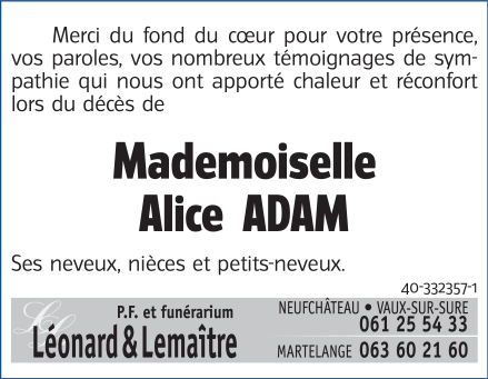 Décédée à Saint-Mard (6762) le jeudi 30 janvier 2020 à l'âge de 95 ans