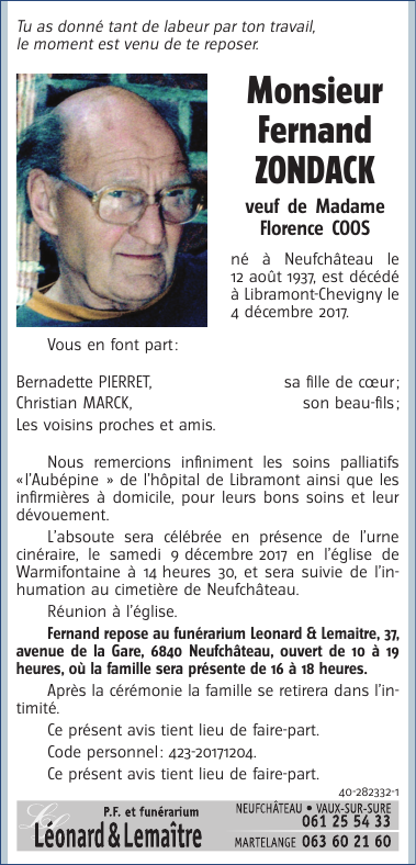 Décédé à Libramont-Chevigny (6800) le lundi 4 décembre 2017 à l'âge de 80 ans