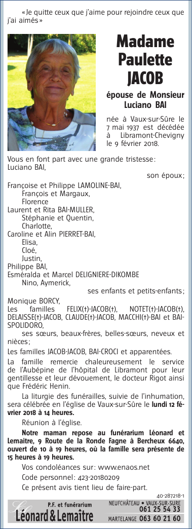 Décédée à Libramont (6800) le vendredi 9 février 2018 à l'âge de 80 ans