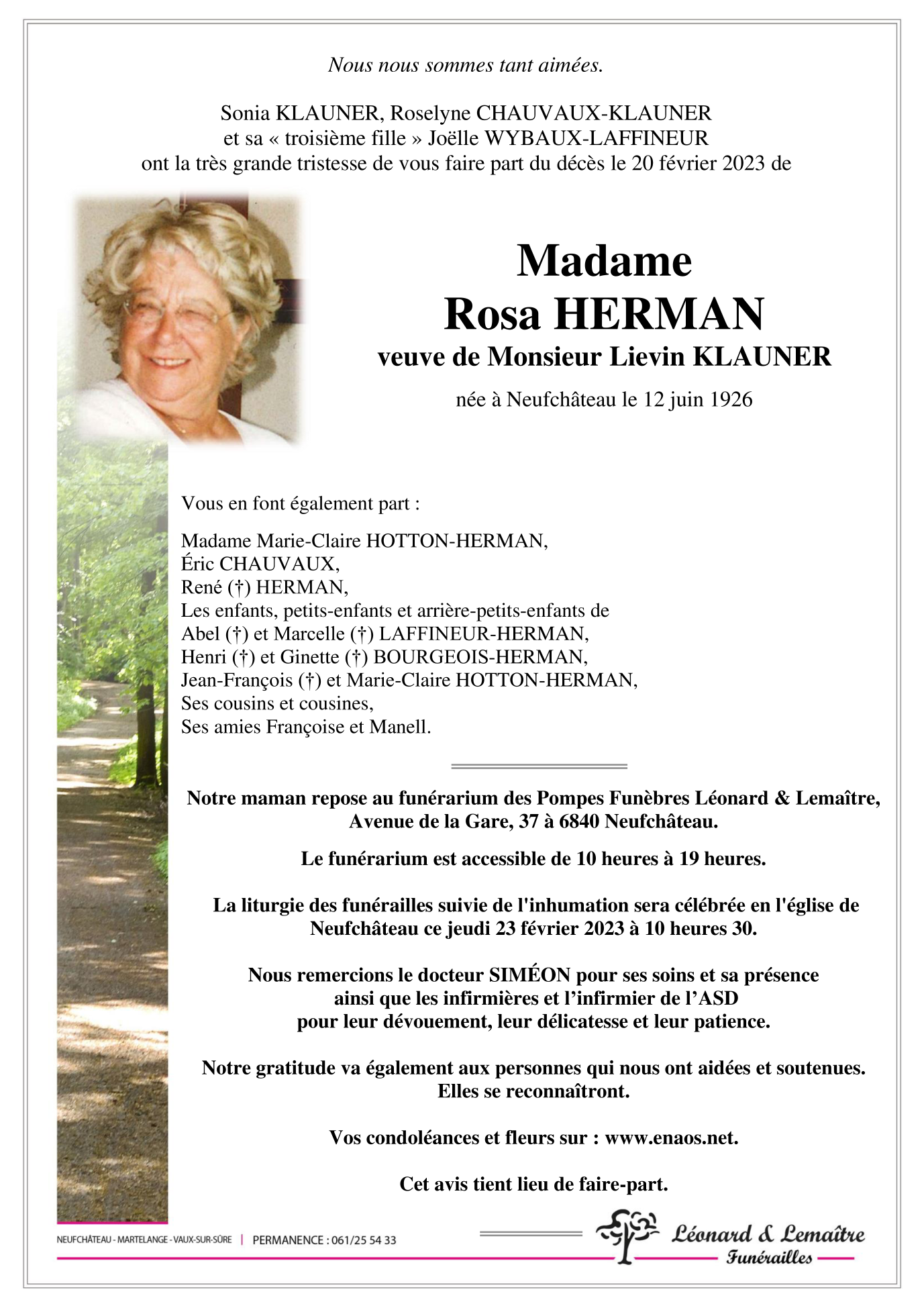 Décédée à Neufchâteau (6840) le lundi 20 février 2023 à l'âge de 96 ans