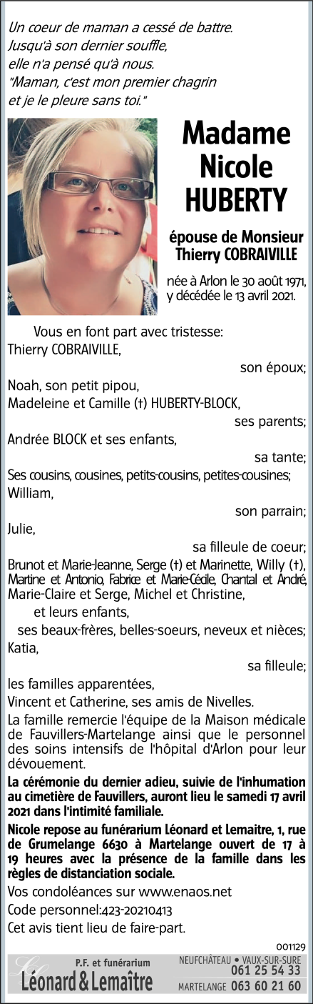 Décédée à Arlon (6700) le mardi 13 avril 2021 à l'âge de 49 ans