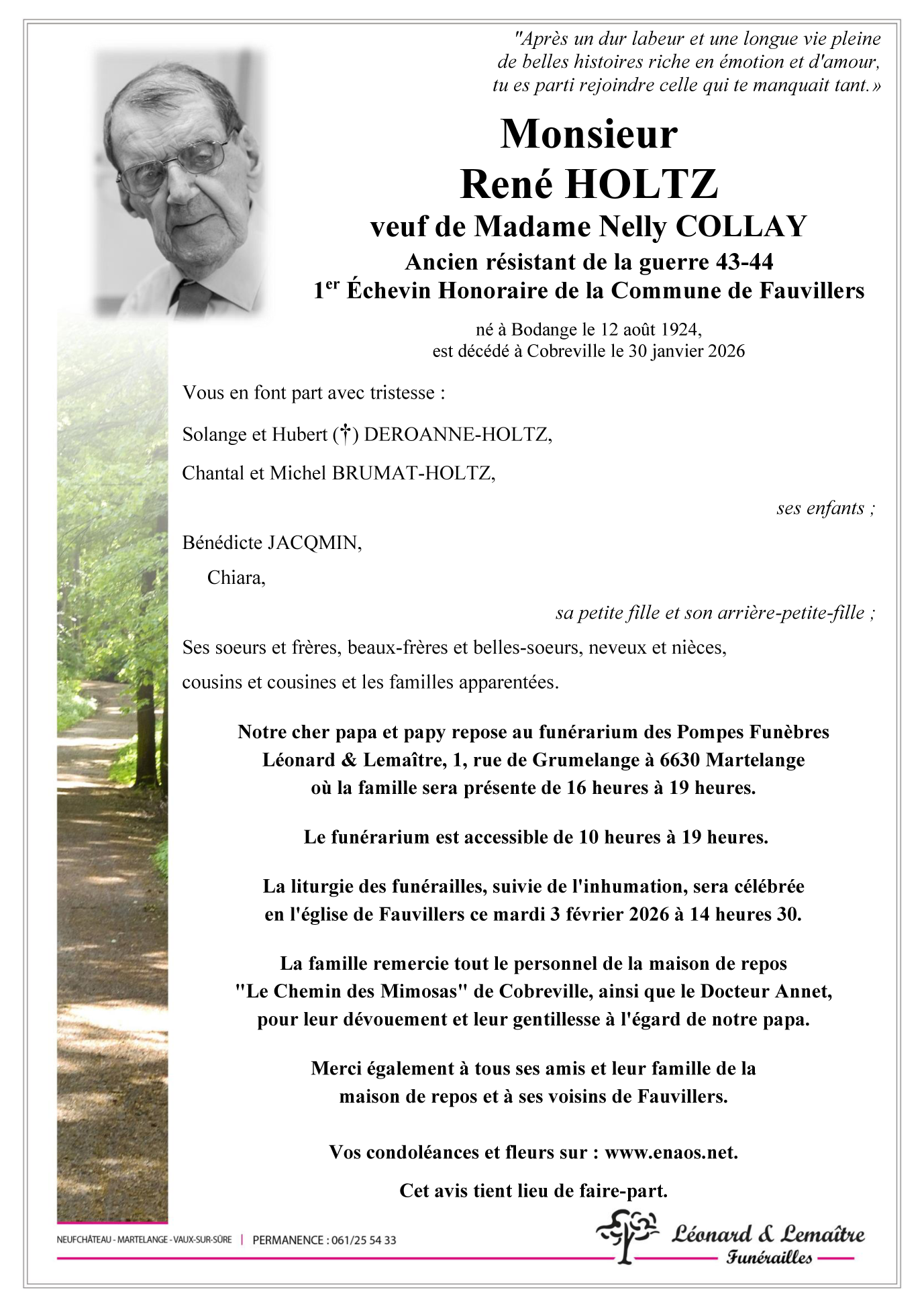 Décédé à Vaux-sur-Sure (6640) le vendredi 30 janvier 2026 à l'âge de 101 ans