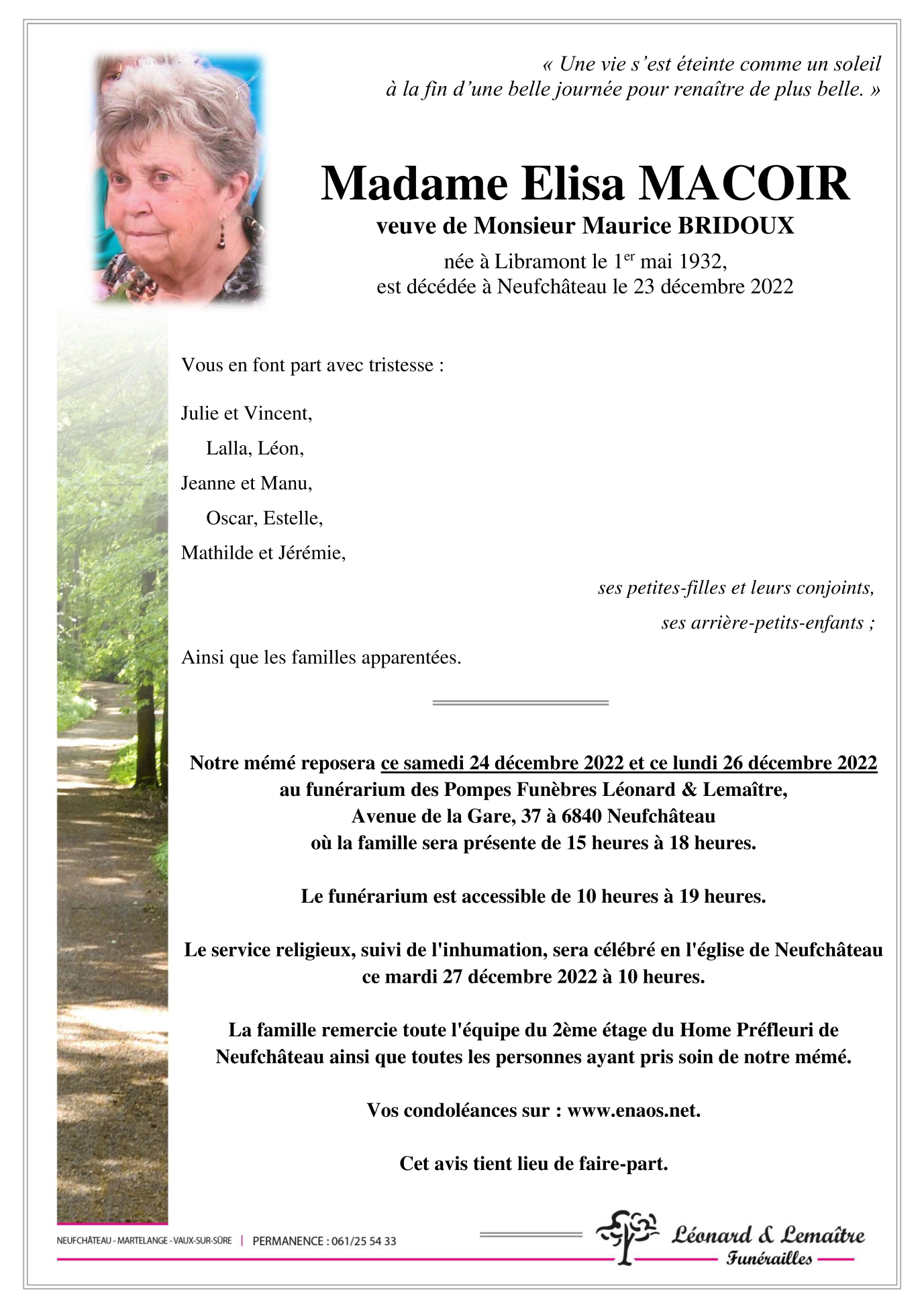 Décédée à Neufchâteau (6840) le vendredi 23 décembre 2022 à l'âge de 90 ans