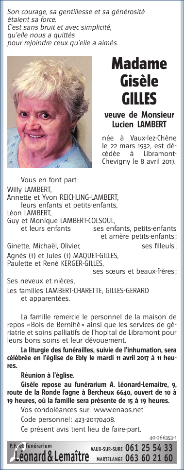 Décédée à Libramont-Chevigny (6800) le samedi 8 avril 2017 à l'âge de 85 ans