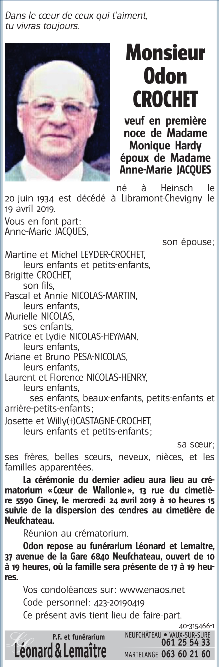 Décédé à Libramont-Chevigny (6800) le vendredi 19 avril 2019 à l'âge de 84 ans