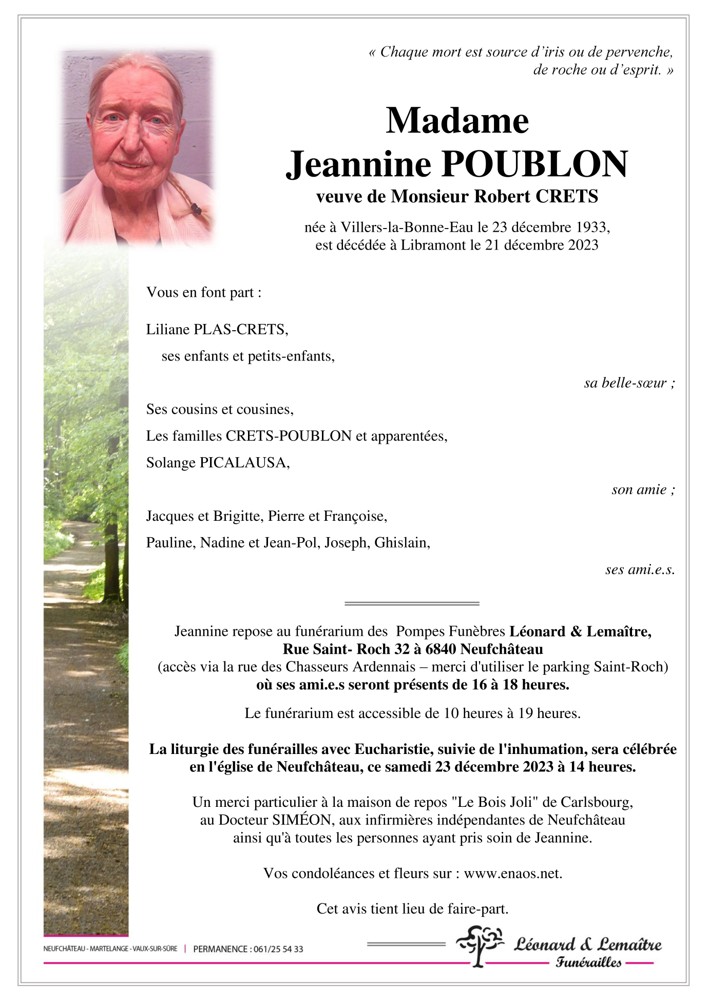 Décédée à Libramont-Chevigny (6800) le jeudi 21 décembre 2023 à l'âge de 89 ans