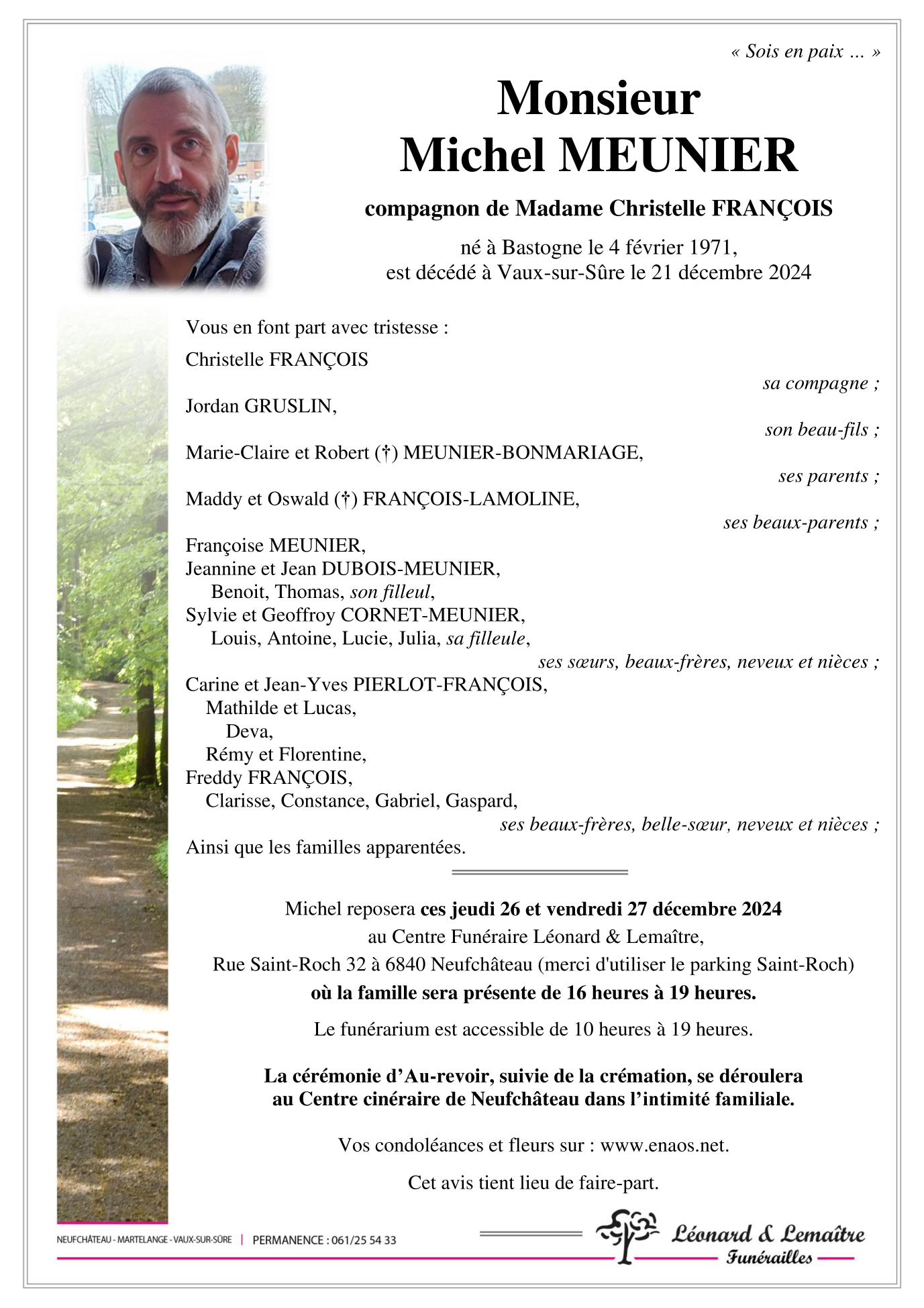 Décédé à Vaux-sur-Sure (6640) le samedi 21 décembre 2024 à l'âge de 53 ans