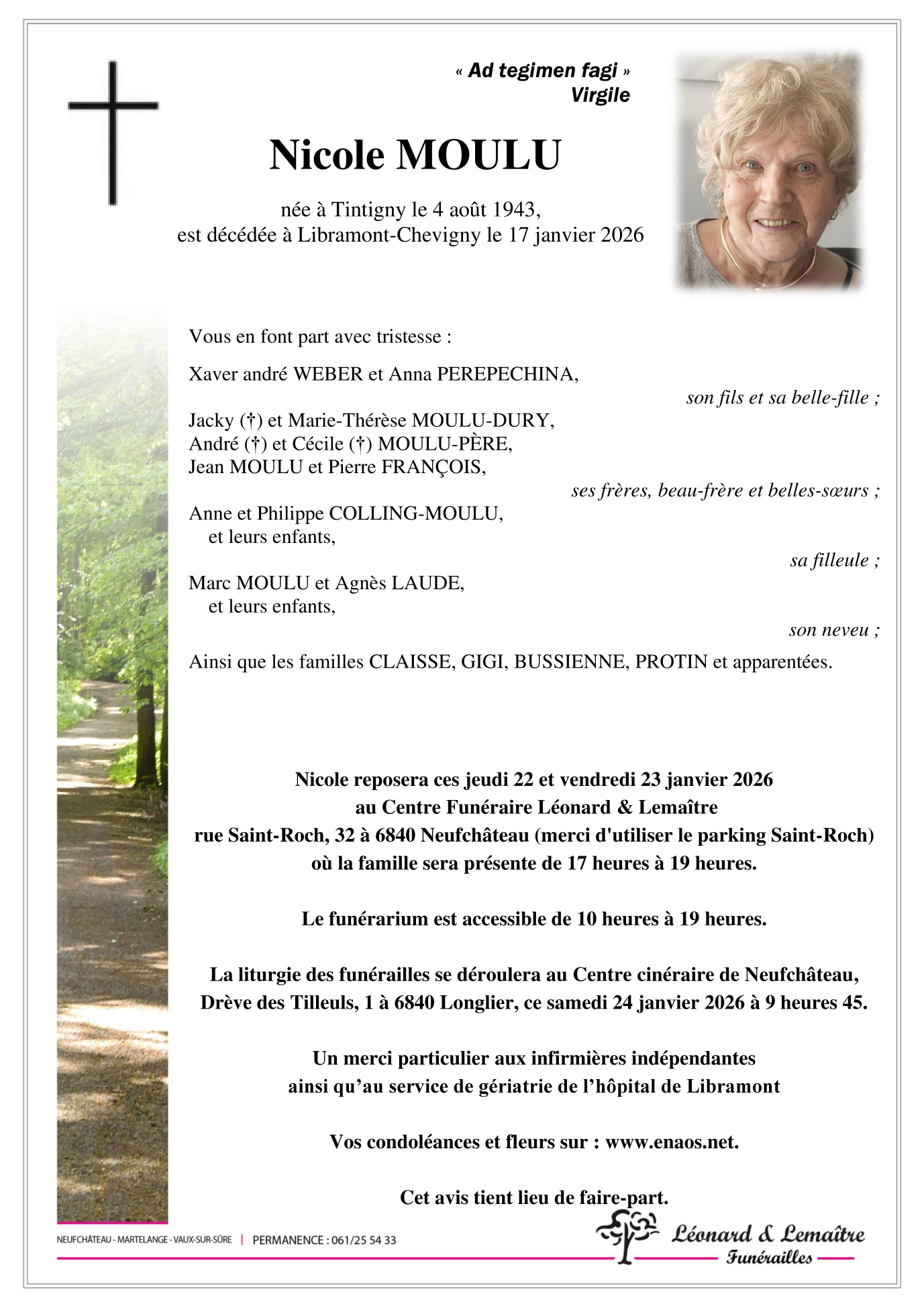 Décédée à Libramont-Chevigny (6800) le samedi 17 janvier 2026 à l'âge de 82 ans