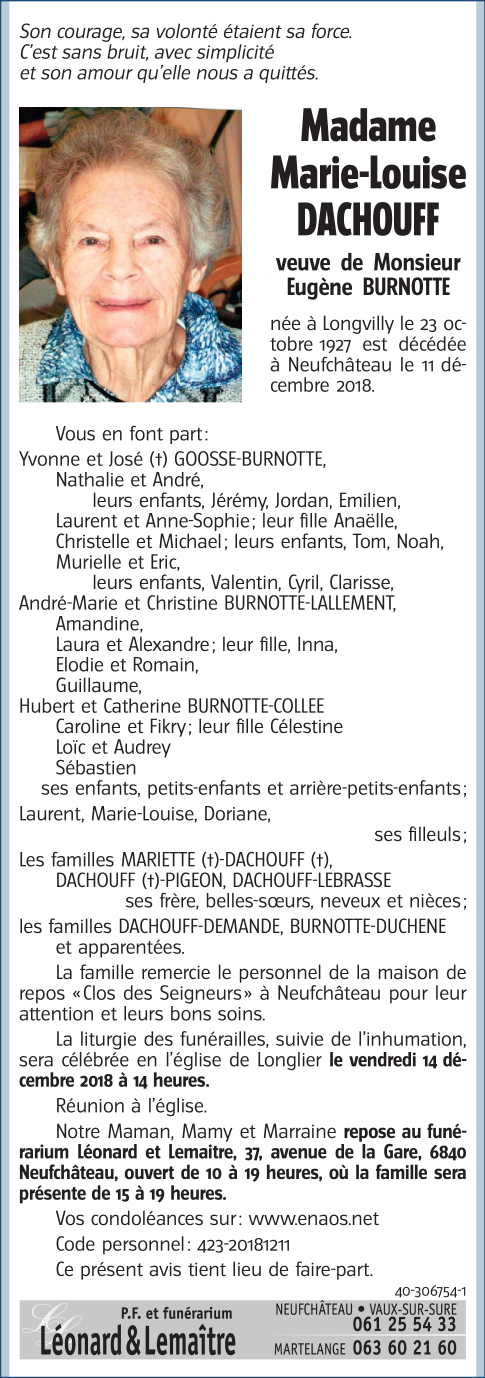 Décédée à Neufchâteau (6840) le mardi 11 décembre 2018 à l'âge de 91 ans