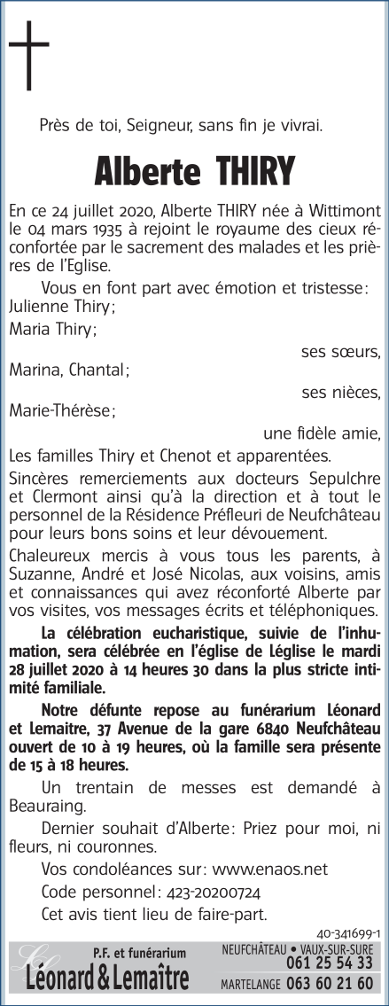 Décédée à Neufchâteau (6840) le vendredi 24 juillet 2020 à l'âge de 85 ans
