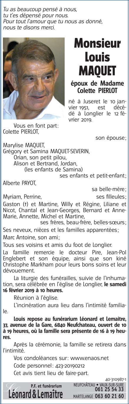 Décédé à Neufchâteau (6840) le mardi 12 février 2019 à l'âge de 68 ans