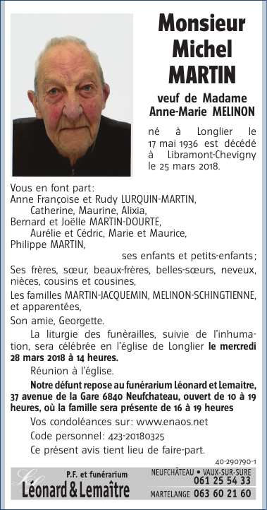 Décédé à Libramont-Chevigny (6800) le dimanche 25 mars 2018 à l'âge de 81 ans