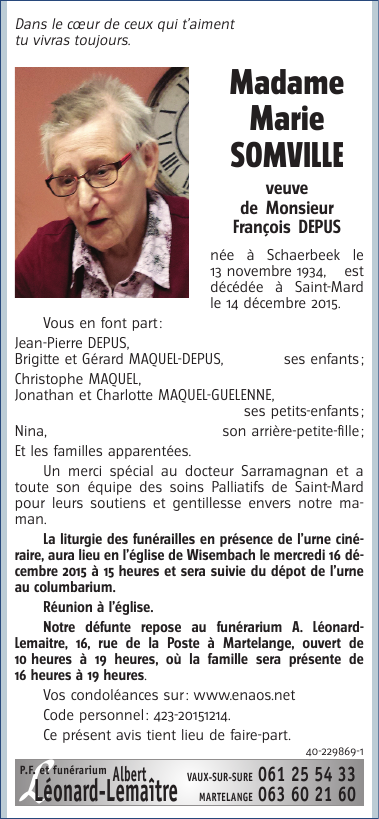 Décédée à Saint-Mard (6762) le lundi 14 décembre 2015 à l'âge de 81 ans