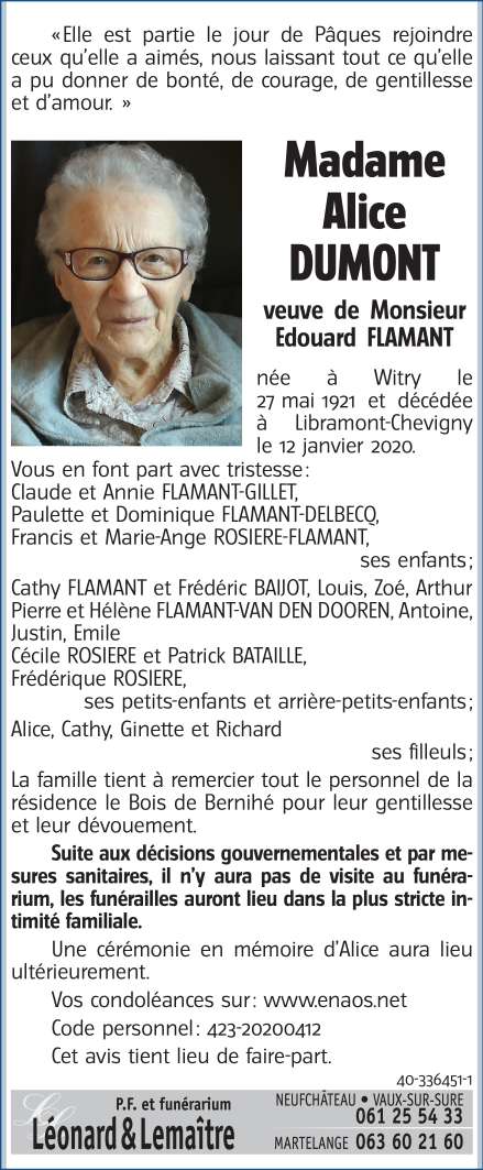 Décédé à Libramont-Chevigny (6800) le dimanche 12 avril 2020 à l'âge de 98 ans