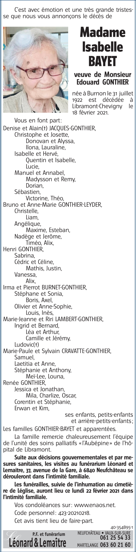 Décédée à Libramont-Chevigny (6800) le jeudi 18 février 2021 à l'âge de 98 ans