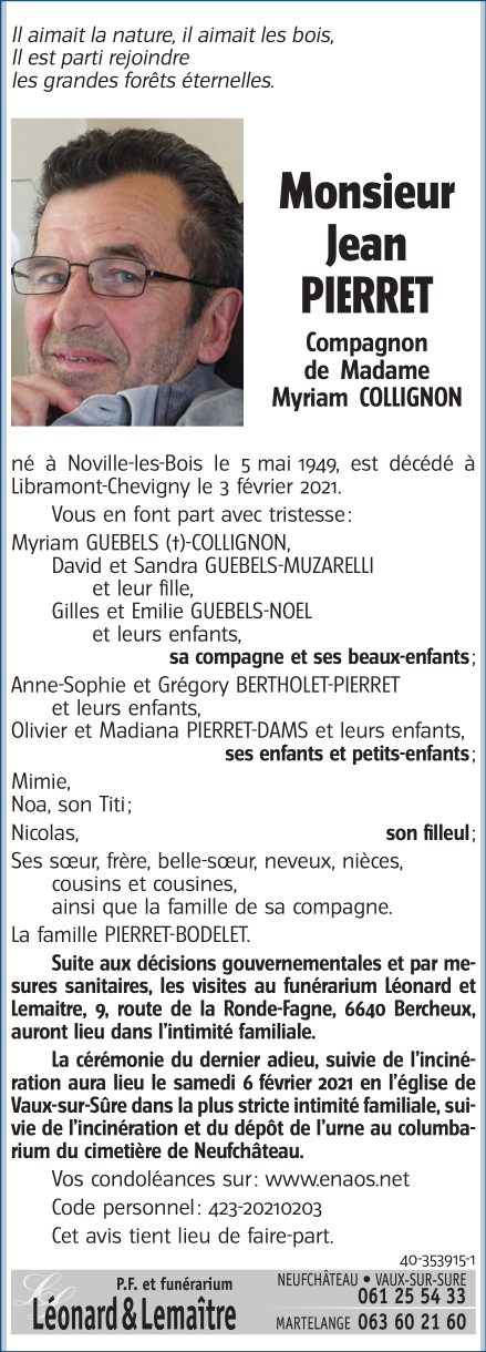 Décédé à Libramont-Chevigny (6800) le mercredi 3 février 2021 à l'âge de 71 ans