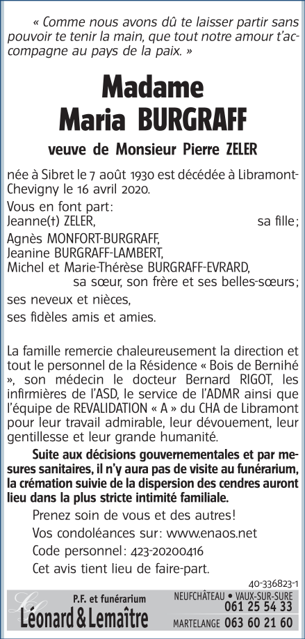 Décédée à Libramont-Chevigny (6800) le jeudi 16 avril 2020 à l'âge de 89 ans