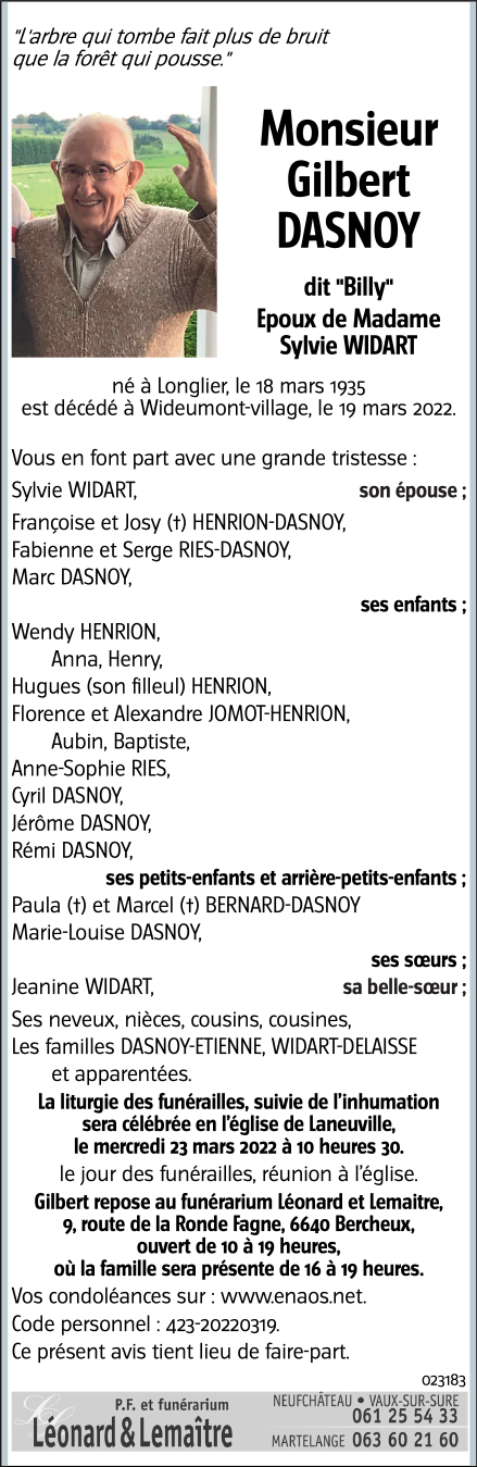 Né à Longlier (6840) le lundi 18 mars 1935