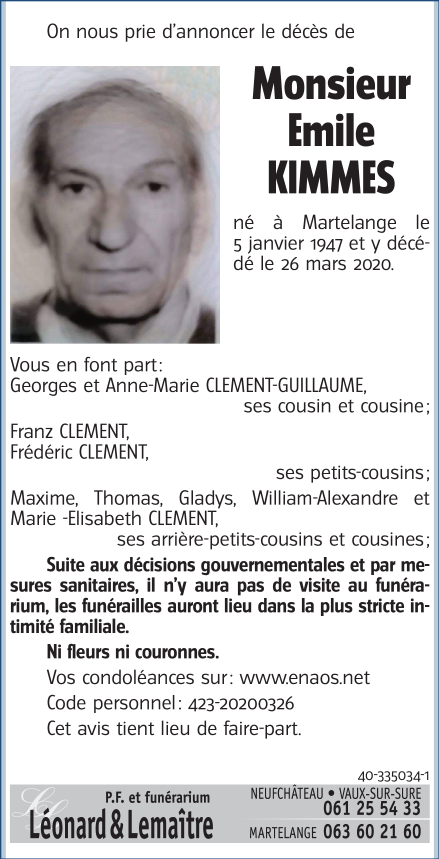 Décédé à Martelange (6630) le jeudi 26 mars 2020 à l'âge de 73 ans