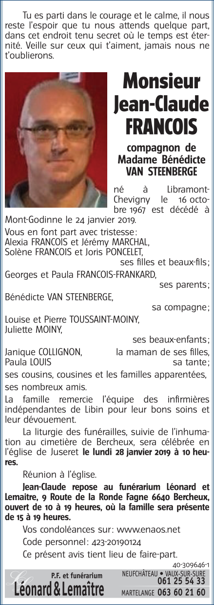 Décédé à Yvoir (5530) le jeudi 24 janvier 2019 à l'âge de 51 ans