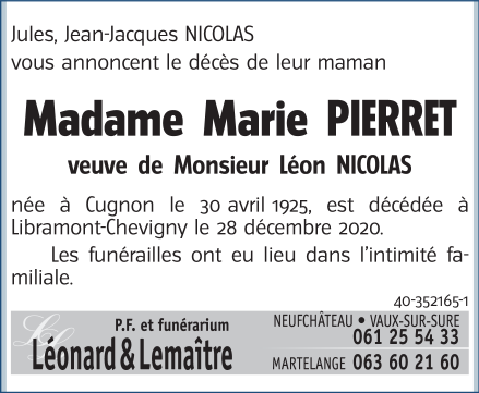 Décédée à Libramont-Chevigny (6800) le lundi 28 décembre 2020 à l'âge de 95 ans