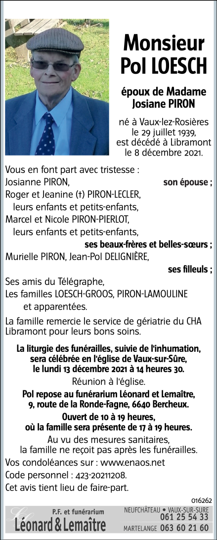 Décédé à Libramont-Chevigny (6800) le mercredi 8 décembre 2021 à l'âge de 82 ans
